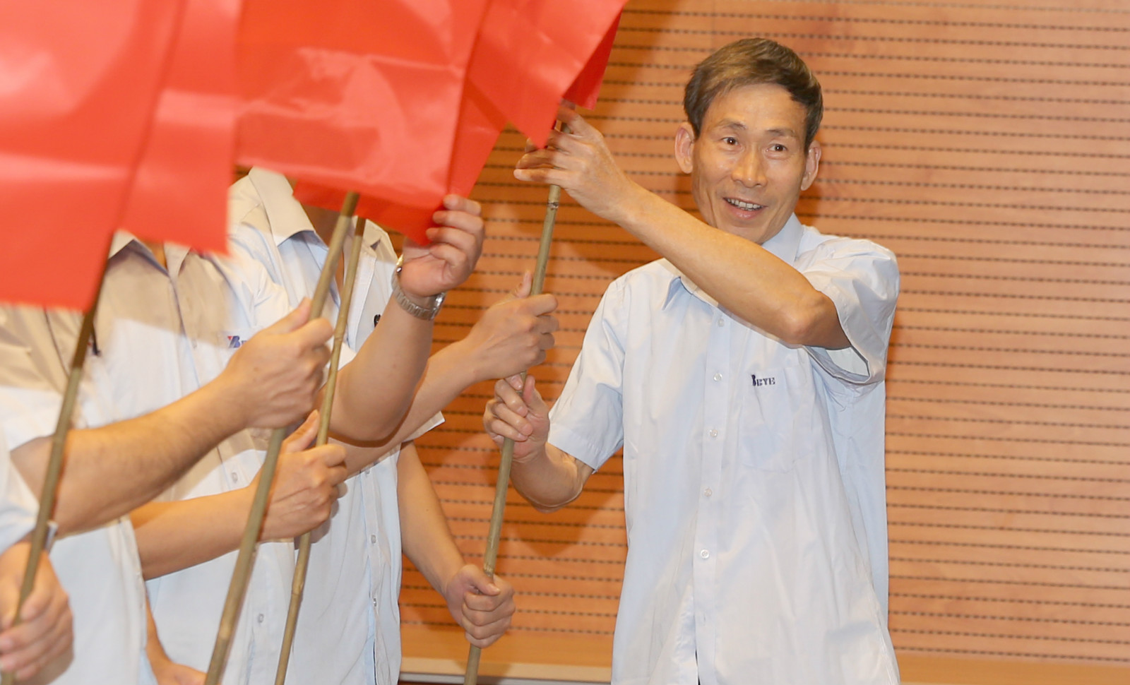胡明聰總裁將十二面鮮紅的隊旗熱情而有力地授予十二支隊伍的代表,這不僅僅是一面代表榮譽和責任的旗幟,更是一面滿含期望與囑托的旗幟,是一代又一代白云人的傳承與發展的旗幟!十二支隊伍接過沉甸甸的隊旗后立即開始了認真而又熱烈的團隊文化創作,似乎想用自己精心創作的隊名回應總裁的鼓勵與期許,“榮耀隊”、“降龍隊”、“人人爭先隊”……綻放出一線管理者們意氣風發、朝氣蓬勃的風采。全場起立,莊嚴的國歌聲將整場的氛圍推向高潮,“前進、前進、前進進……”氣勢磅礴的樂曲再次點燃了每個人銳意進取的奮斗精神!